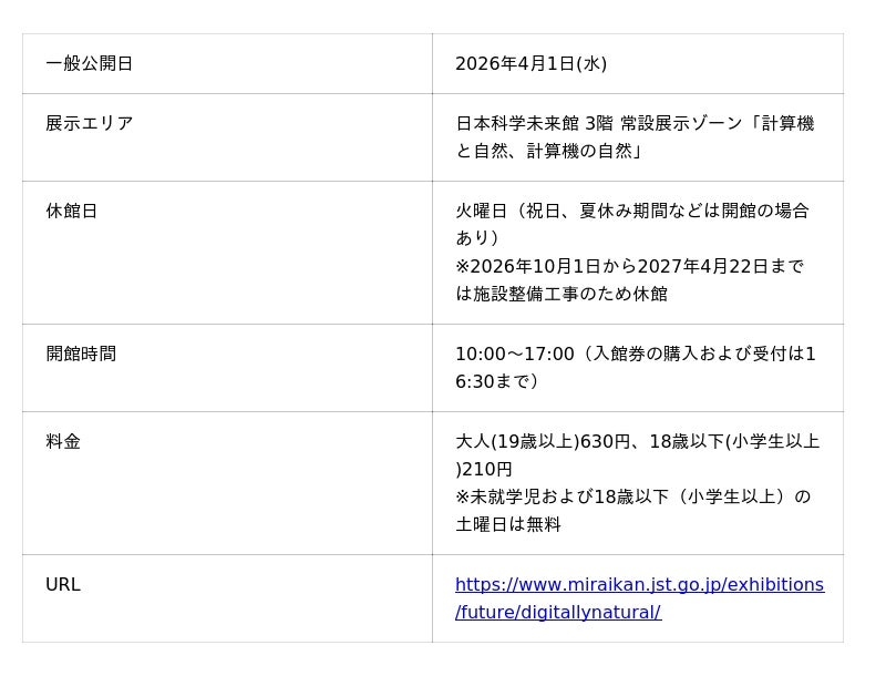 日本科学未来館(略称:未来館 館長:浅川智恵子)は、大阪・関西万博シリーズ第二弾として、万博のシグネチャーパビリオン「null2(ヌルヌル)」を手がけた落合陽一氏(メディアアーティスト)が総合監修を務める常設展示「計算機と自然、計算機の自然」を一部リニューアルし、2026年4月1日(水)から一般公開します。