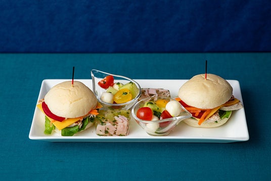 ケイジャンチキンのサンドウィッチ、メロンのジャンボンペルシエ、メロンのカプレーゼ