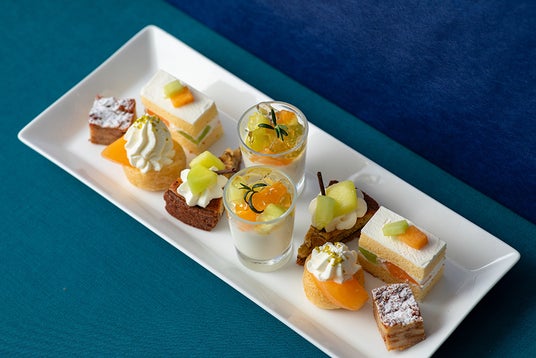 スイーツは、メロンの風味を軽やかに引き立てるクリームを合わせた“ショートケーキ”や“シュークリーム”、涼やかな喉ごしが魅力の“ココナッツのパンナコッタ”、果実の甘さが重なり合う“メロンとバナナのタルト”などの全5品をご用意しました。初夏らしい爽やかな甘さが、ひと口ごとに広がります。