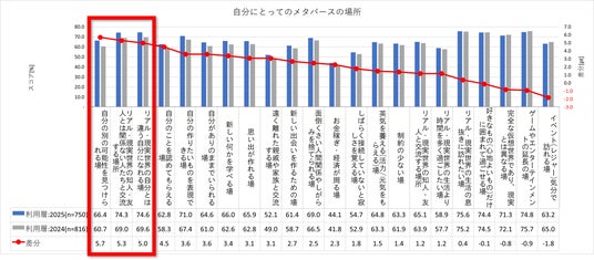 「自分にとってのメタバースの存在」について経年で比較したところ、「自分の別の可能性を見つけられる場」が66.4%(+5.7pt)、「現実世界の自分とは違う自分になれる場」が74.6%(+5.0pt)と上昇しました。「リアル・現実世界の知人・友人とは関係ない人たちと交流する場所」も74.3%(+5.3pt)と上昇しており、メタバースで出会った人たちとの交流や活動が、新たな自分の可能性の発見につながっていることが示唆されました。