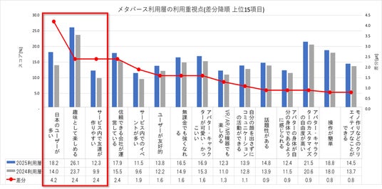 メタバース利用層の利用重視点では前年と比較して、「日本のユーザーが多い:18.2%(+4.2pt)」や「趣味として楽しめる:26.1%(+2.4pt)」、「サービス内で友達が作りやすい:12.3%(+2.4pt)」が伸長しました。”メタバース”では、様々な国籍のユーザーが集い、デジタルな肉体(スキン)を使って、共通の動作(エモート)を行うことで「グローバルな友達作りやコミュニケーション(異文化への出会い)」、「仮想現実への冒険」ができる場として注目されていましたが、現状日本国内では「日本語で友達作りができる日常空間」としての実用性を求め始めていることが窺えます。 一方で、AIによるリアリタイム翻訳の一般化によって、メタバース空間でのグローバルコミュニケーションが増加することを考慮すると、本傾向は今後変わる可能性が考えられます。