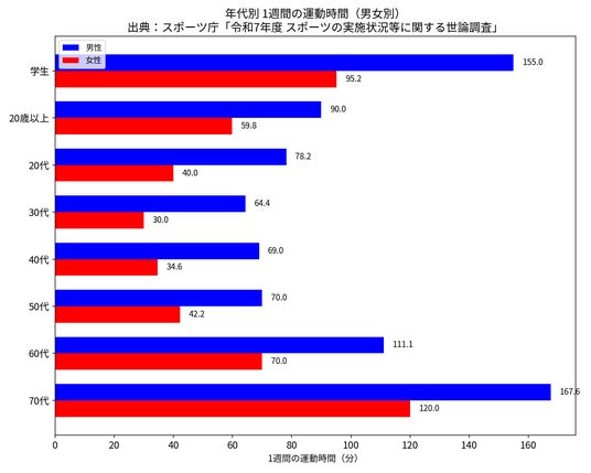 スポーツ庁の調査によると、『就業者については、勤務先で「運動・スポーツを活用した取組」がなされているかどうかで週1日以上のスポーツ実施率に大きな差がある』とされています。つまり、勤務先での運動の機会が少ない「子育て世帯(20~50代)」や「勤務先に運動の取り組みがない人」が運動不足の傾向にあります。