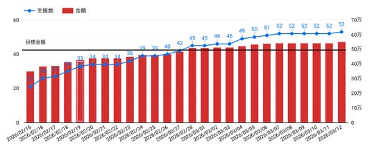 - 最終的な支援金額は 551,000円となり、1stゴール(50万円)を110%で達成しました。支援者数は 53名となりました。