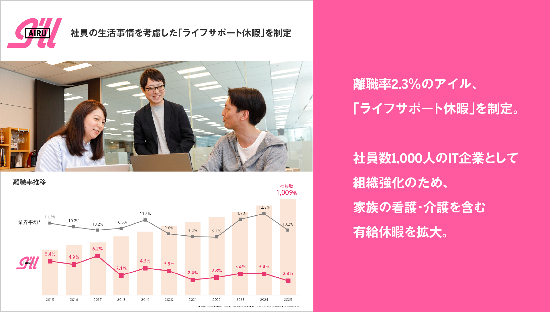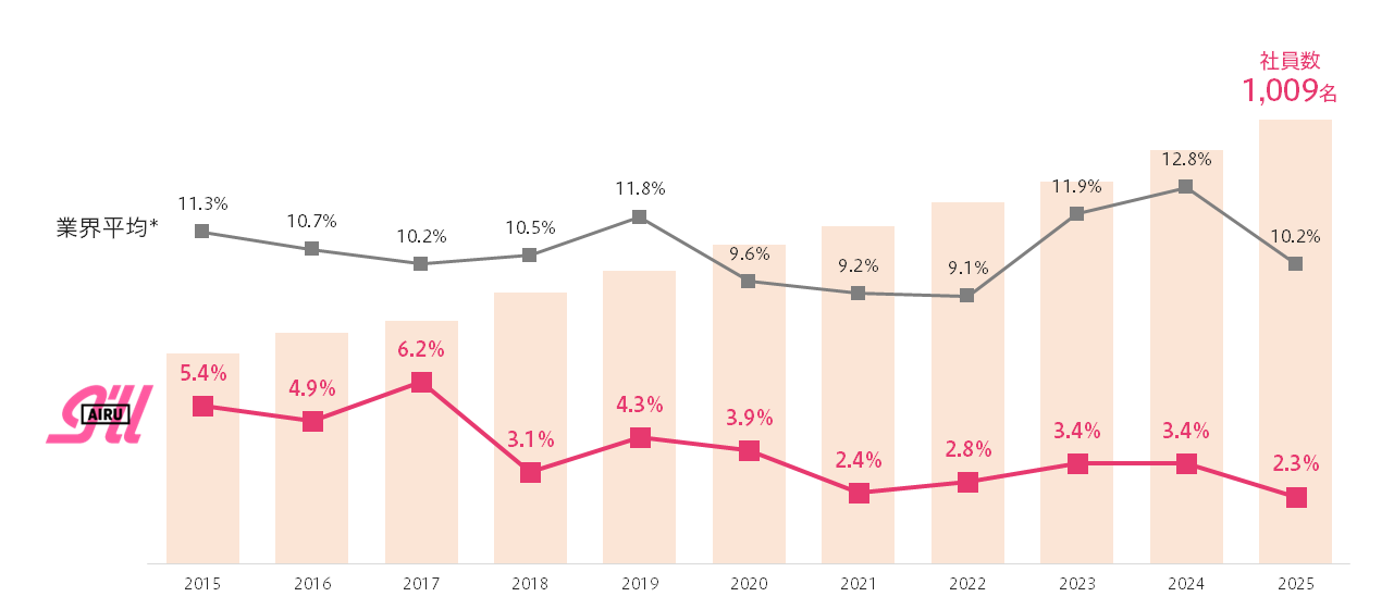 昨今人材不足や高離職率が社会課題とされるなか、当社はこの10年間で社員数が約500人から1,000人に倍増しましたが、離職率は過去10年で最も少ない2.3%(2025年7月末時点)であり、業界平均10.2%(※)を大きく下回っています。