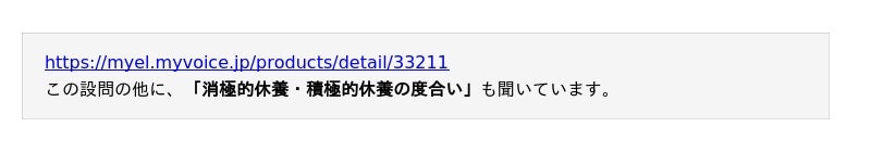 休養をとる状況や過ごし方、自由記述にて効果的なとり方などについて聞いています。調査結果をお知らせいたします。