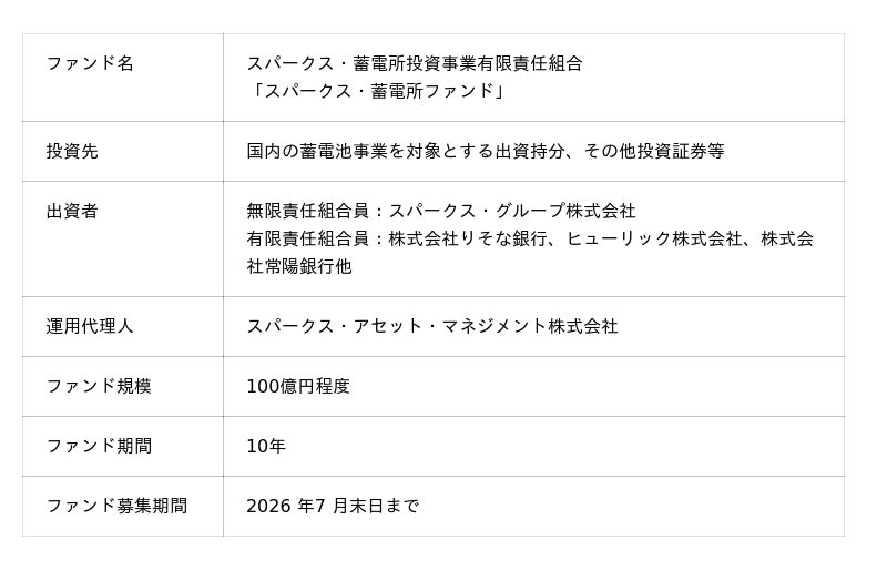 スパークス・グループ株式会社(以下、スパークス)は、我国のカーボンニュートラル実現に向けた新たな取り組みとして、市場運用による収益獲得を目指すマーチャント(市場運用)型蓄電所事業を主な投資対象とした「スパークス・蓄電所ファンド」(以下、本ファンド)を設立いたしました。