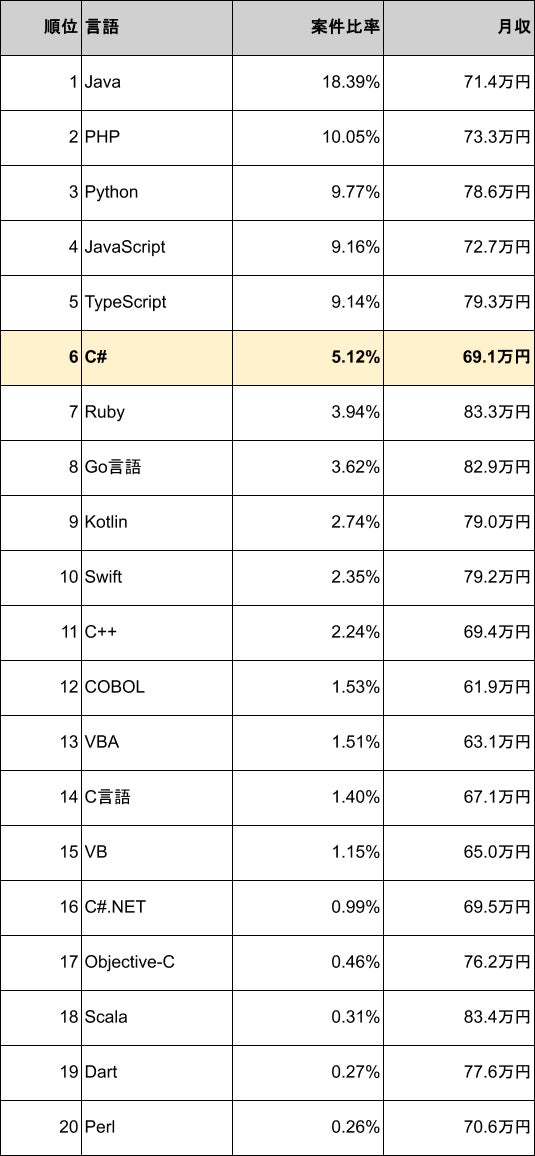 C#の案件比率は5.12%で、プログラミング言語別の案件数ランキングでは6位に位置しています。