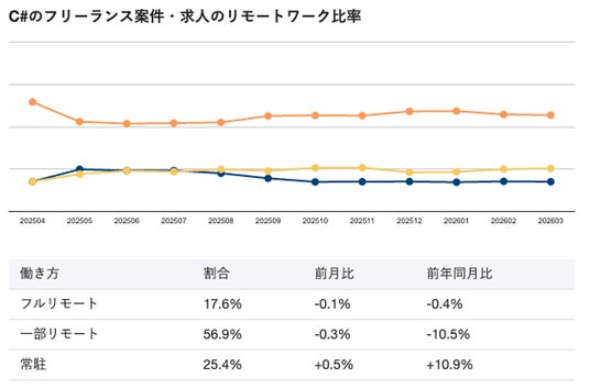 2026年3月時点のC#向けフリーランス案件・求人におけるリモートワーク比率は、フルリモートが17.6%、一部リモートが56.9%、常駐が25.4%となっています。