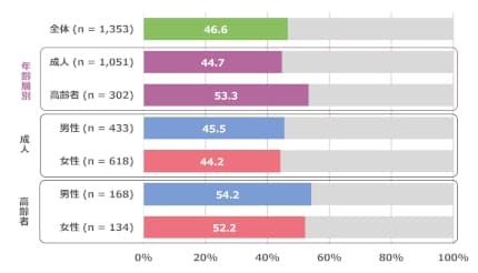 最新調査の速報値によると、推奨身体活動量の達成率は全体で46.6%となった。年齢層別では、20-64歳の成人が44.7%、65-79歳の高齢者が53.3%、性別でみると、成人男性では45.5%、女性は44.2%、高齢者男性では54.2%、女性は52.2%となり、成人の達成率は2024年度調査に続いて半数を下回った。