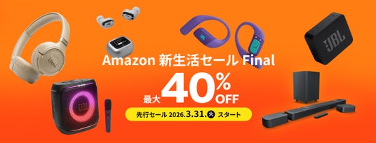 アメリカ カリフォルニア発祥の世界最大級のオーディオブランド「JBL」を擁するハーマンインターナショナル株式会社(本社:東京都千代田区、代表取締役:桑原拓磨)は、運営するJBL公式Amazon店にて3月31日(火)~4月6日(月)(先行セール期間含む)にて開催されるAmazon新生活セールにおいて、人気のワイヤレスイヤホンやポータブルスピーカー、サウンドバーをはじめとする公式限定モデルを、最大40%オフのセール価格で販売いたします。