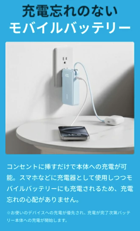 コンセントから外せばモバイルバッテリーとして使えるので、充電忘れの心配もゼロ。