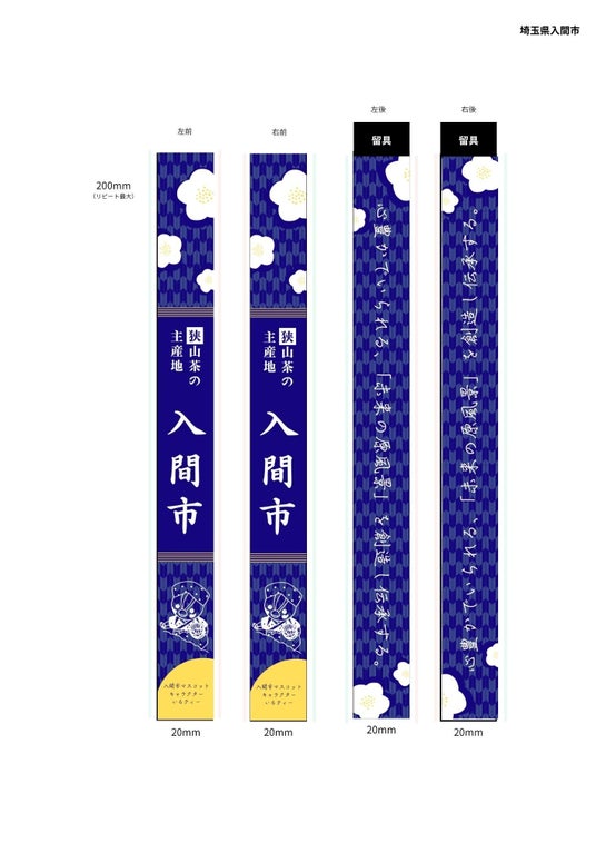 限られた20mmの幅には、日本の伝統文様「矢絣(やがすり)」や茶の花、市のマスコットキャラクター「いるティー」、そして市のパーパス(心豊かでいられる、「未来の原風景」を創造し伝承する。)がデザインされています。狭山茶の産地である入間市としては、通常なら茶を連想させる「緑色」を選ぶことが多いのですが、今回は「日本の伝統を世界にも知ってほしい」という同市の強い思いから、あえて緑色を外し、日本の伝統色である「藍色」を採用しました。