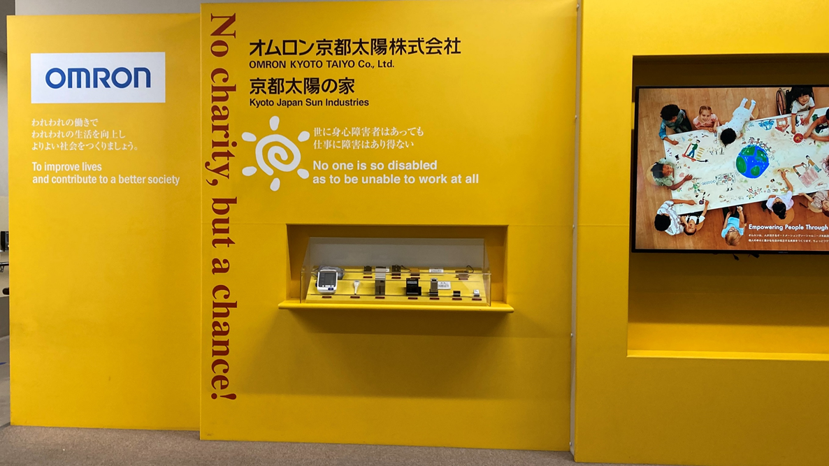 ▲工場入り口の案内パネル。「太陽の家」とオムロン両社の理念が掲げられています