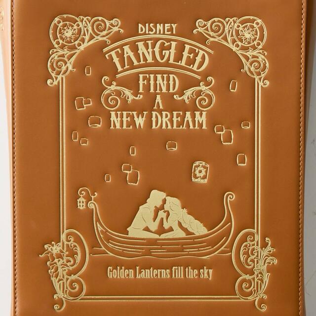 コーディネートしやすいキャメルの本体に、ラプンツェルとユージーンがボートに乗ってランタンを眺めるロマンチックなシーンが、豪華な金の型押しプリントでデザインされています。