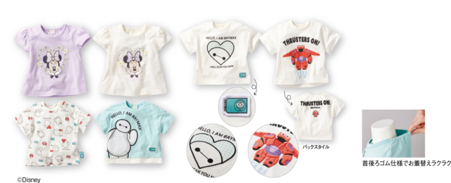 お出かけ着から普段用、通園服まで便利に使える半袖Tシャツは、ぷっくり袖が可愛いミニーや、ユニセックスに着回せるベイマックスデザインが新たに登場。