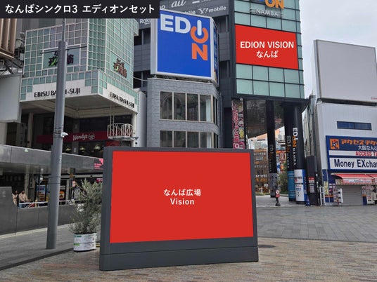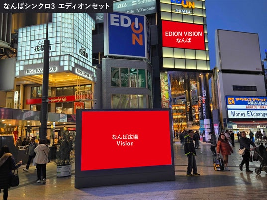 また、動画放映開始に合わせ、近隣の屋外ビジョン「EDION VISIONなんば」と連動した「シンクロ放映メニュー」の販売を開始。ミナミの象徴的な公共空間を、複数ビジョンによる動画放映でジャックする、インパクトのあるOOHメディアを提供してまいります。