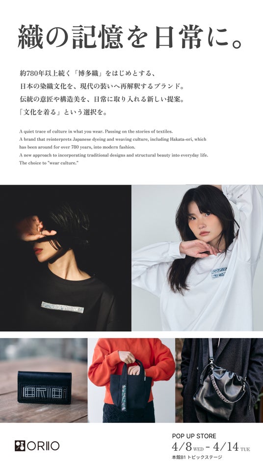 福岡発の文化ブランド ORIO(オリオ) は、2026年4月8日(水)~4月14日(火)の期間、大丸福岡天神店本館B1 トピックステージにてPOPUP SHOPを開催します。