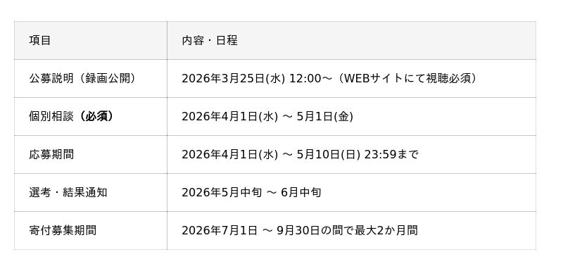 - 広報支援:募集開始時やプロジェクト告知の際、財団の媒体を通じた広報協力を行います。