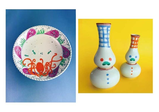 動物をテーマにした絵付けでアップサイクルしたお皿が勢揃い。2人によるZINEやグッズ、イラスト作品もお楽しみいただけます。