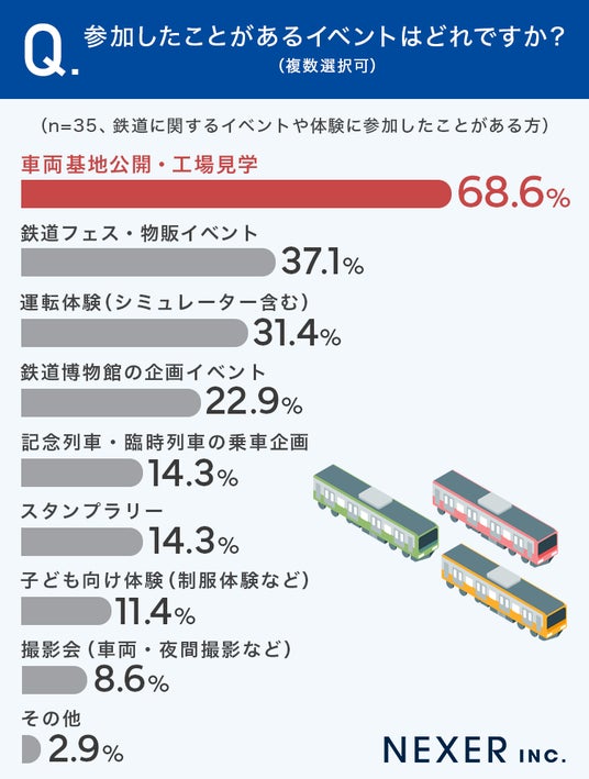 最も多かったのは「車両基地公開・工場見学」で68.6%でした。次いで「鉄道フェス・物販イベント」が37.1%、「運転体験(シミュレーター含む)」が31.4%、「鉄道博物館の企画イベント」が22.9%と続きます。