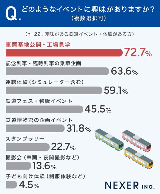 最も多かったのは「車両基地公開・工場見学」で72.7%でした。次いで「記念列車・臨時列車の乗車企画」が63.6%、「運転体験(シミュレーター含む)」が59.1%、「鉄道フェス・物販イベント」が45.5%と続きます。