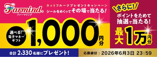 青果の総合流通企業の株式会社ファーマインド(本社:東京都千代田区、代表取締役社長COO:小林格)は、2026年4月1日(水)より、選べる電子マネーギフトが当たる『カットフルーツマイレージキャンペーン』を実施します。対象商品に付いているシールをめくり、二次元コードにアクセスいただくと抽選画面となり、その場で当たりが分かるインスタントウィンキャンペーンです。