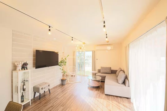 家族でゆったり過ごせる明るいリビング,大型ソファ&大型TVでリラックス空間