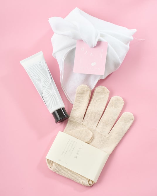 使い込まれた手は働き者の証だけど、手肌がしっとりしているとうれしいもの。くらしきぬの「シルク100%手袋」と「HAA for rest 間の香 ハンドクリーム」をセットにしました。夜のご自愛習慣を提案します。