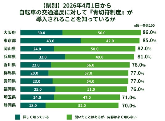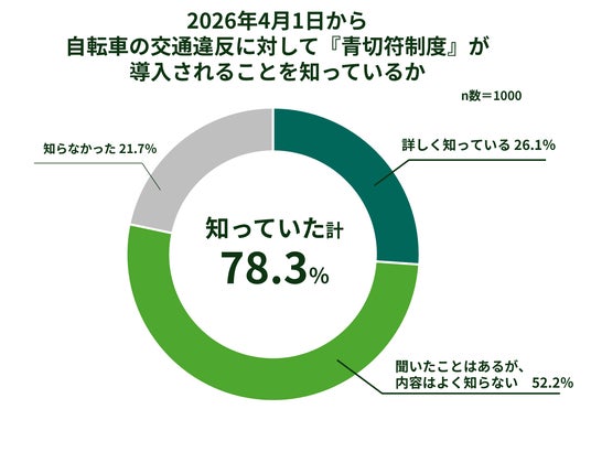 自転車の交通違反に反則金を課す青切符制度の導入について、認知している人は78.3%でしたが、 「詳しく知っている」人は26.1%にとどまりました。