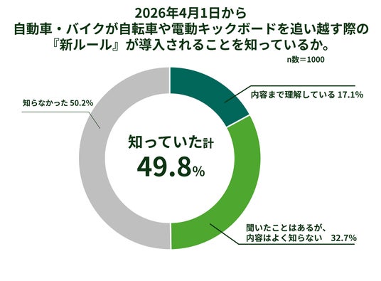 また、自動車やバイクが自転車・電動キックボードを追い越す際、十分な側方間隔を保つことを求める新ルールについては、認知が49.8%、内容理解は17.1%と低い理解率でした。