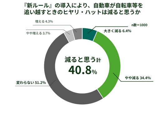 自動車で自転車や電動キックボードを追い越す際に十分な側方間隔を保つことが定められた新ルール により、ヒヤリ・ハットが「減ると思う」と答えた人は40.8%と半数にも満たず、「変わらない」(51.2%)と答えた人の方が多い結果となりました。