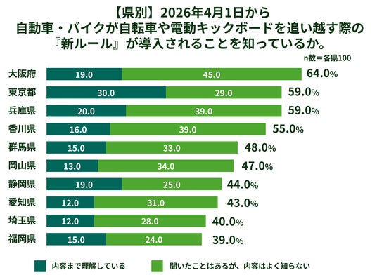 2026年4月1日から改正道路交通法が施行されることの認知は75.4%に達しました。しかし、「内容まで理解している」人は27.4%にとどまり、約半数が「内容はよく知らない」と回答して います。また、東京都や大阪府では内容の理解率が高い一方、岡山県や群馬県、愛知県、静岡県は 20%台前半と、地域差が見られる結果となりました。