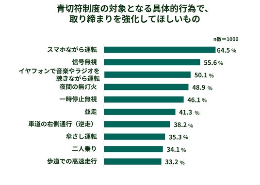また、取り締まり強化を求める違反行為として最も多いのは「スマホながら運転」(64.5%)でした。日常生活で目にするなど、危険性を体感していることが背景にあるとみられます。