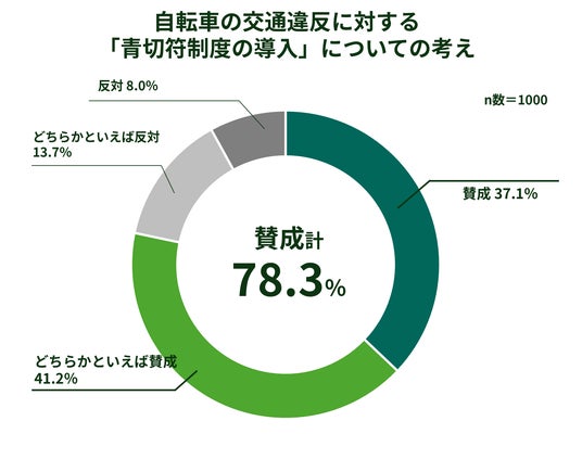 自転車の交通違反に対する青切符制度の導入について、「賛成」「どちらかといえば賛成」と答えた人は78.3%に達し、制度導入への支持は高い水準でした。制度導入の背景にある自転車マナー違反に 対する社会的な懸念が高まっていることが推測されます。