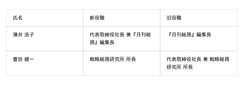 豊田 健一は引き続き戦略総務研究所 所長として、また薄井 浩子は『月刊総務』編集長を兼任し、これまでの知見と経験を生かしながら、当社の事業および総務分野の発展に取り組んでまいります。