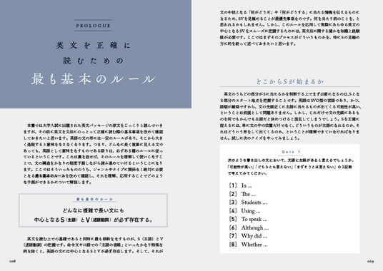 「精読」とは、英文の表面的な意味を追うだけでなく、文章の構造、文脈、そしてその背景にある思想や論理まで深く読み解くことで、本質的な理解と多角的な視点を養う学習法です。本書の「PROLOGUE(序章)」では、「英文を正確に読むための最も基本のルール」を徹底解説します。文頭の数語から構造を予測する思考プロセスなど、精読の土台を固めることで、修飾語句に惑わされず、書き手の意図を正確に受け取るための基本ルールを身につけます。このルールの運用こそが精読の基本となります。
