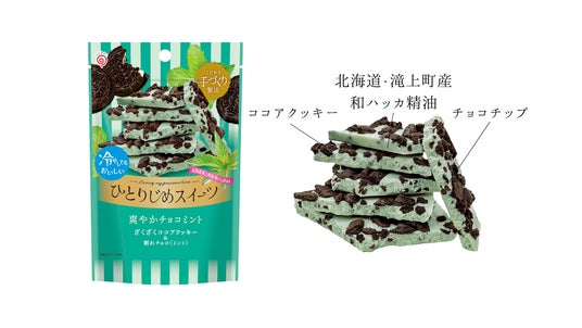 和ハッカらしい清涼感と爽快な味わいのチョコレートにチョコチップ・ココアクッキーを合わせました。ひとりじめスイーツの春夏限定定番品として好評につき再登場します。
