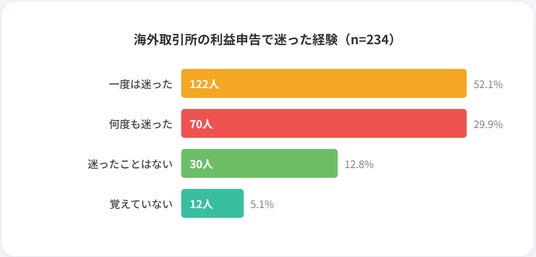 海外取引所の利益申告について「迷った経験」を調査したところ、実に82.0%ものユーザーが何らかの迷いを感じていることが判明しました。
