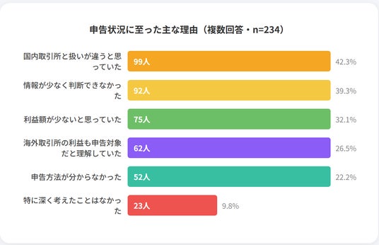 前述の申告状況に至った理由を尋ねたところ、「国内取引所と扱いが違うと思っていた」という回答が42.3%で最多となりました。