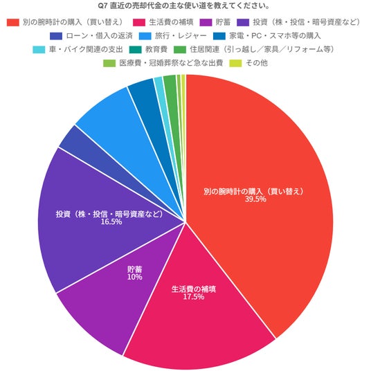 直近の売却代金の主な使い道は、「別の腕時計の購入(買い替え)」39.5%が最多でした。