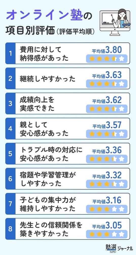 オンライン塾の評価項目のなかで最も高かったのは「費用に対する納得感があった」でした。