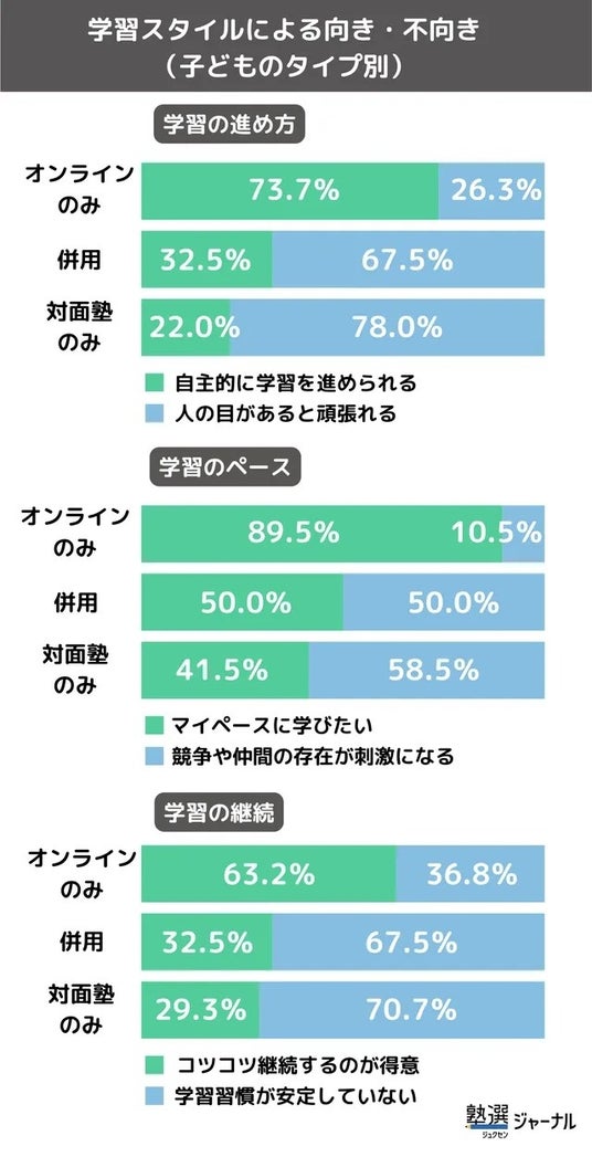 オンライン学習は通塾時間がなく、自分のペースで学習を進めやすい環境。そのため、自分で学習リズムを作れるタイプの子どもほど活用しやすい傾向となりました。