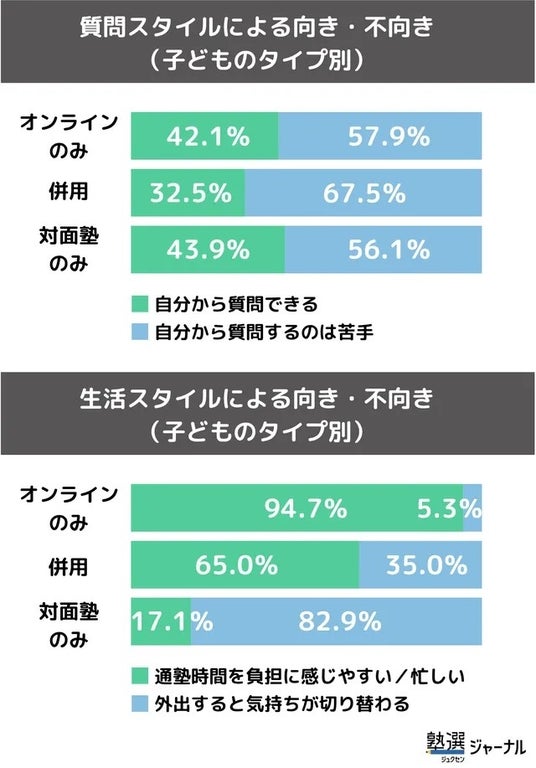 また、生活面でも「通塾時間を負担に感じやすい」「部活や習い事で忙しい」と答えた家庭の94.7%がオンライン塾のみを利用しており、忙しい生活スタイルとの相性の良さも特徴です。