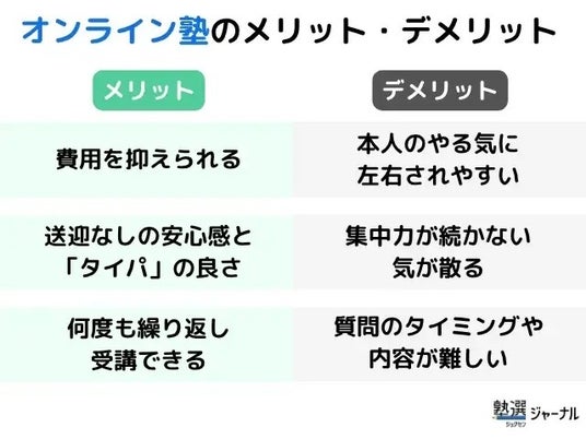 オンライン塾には「費用や時間の効率の良さ」や「繰り返し学習のしやすさ」といったメリットがある一方で、「本人のやる気」や「主体性」に影響されやすいという側面もあるようです。