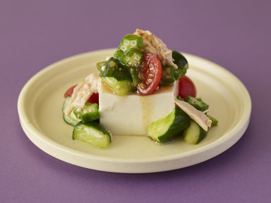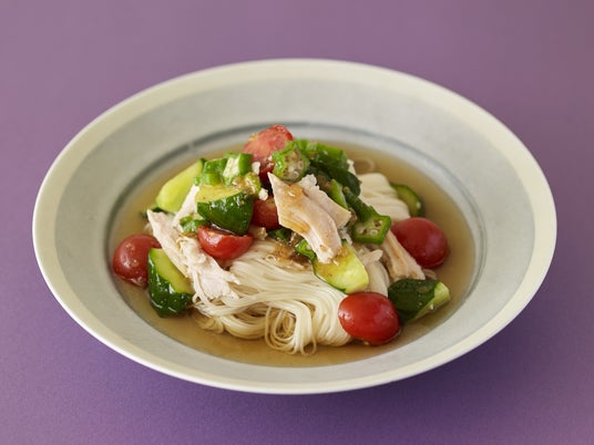 きゅうり、ミニトマト、オクラなどの夏野菜とサラダチキンにドレッシングをかけて、よく混ぜ合わせて作ったマリネを、そうめんや冷ややっこにのせるだけで一品料理が完成します。