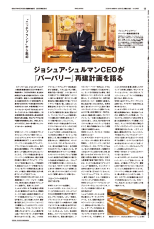 またビジネストピックスでは、海外から「バーバリー(BURBERRY)」のジョシュア・シュルマン(Joshua Schulman)最高経営責任者(CEO)、国内からそごう・西武の田口広人・社長へのインタビューを実施。それぞれの共通点は「再建」。「バーバリー」は、2024年11月に打ち出した中長期計画「バーバリー・フォワード」戦略により、ブランドの代名詞でもあるアウターやスカーフ強化が奏功し、回復傾向にあります。シュルマンCEOが語る独自戦略と、その課題と期待を聞きました。そごう・西武・田口社長に、58年間営業した「西武渋谷店」閉店の背景、そしてそごう・西武の未来について切り込んだ林芳樹・副編集長がこの動向について分析します。