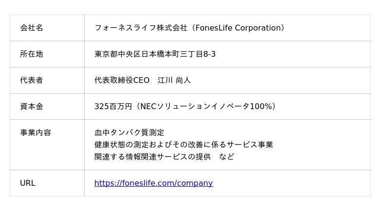 フォーネスライフは、デジタル技術でヘルスケア領域にソリューションを提供するNECソリューションイノベータが100%出資する会社です。米国SomaLogic社の血中タンパク質測定技術と、NECグループのビッグデータ解析・先端ICTを用い、認知症などの将来の疾病リスク予測に基づく、一人ひとりに適した生活習慣の改善提案を行うことで、 “誰も病気にならない未来”、“誰もが自分らしく生きられる社会”の実現を目指しています。