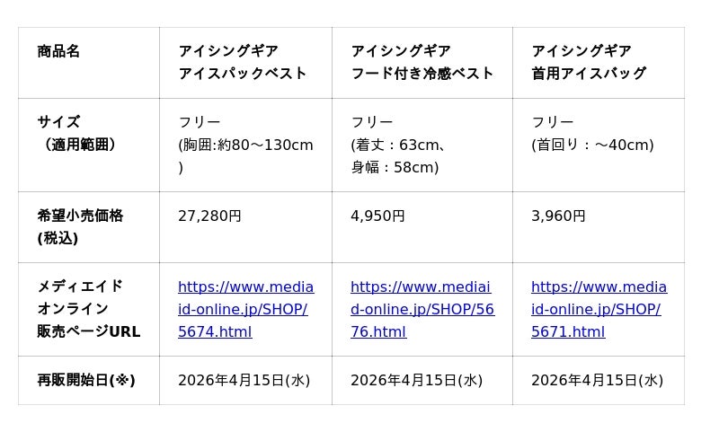 ▲メディエイドは4月15日より、暑さ対策アイテム3製品を再販開始