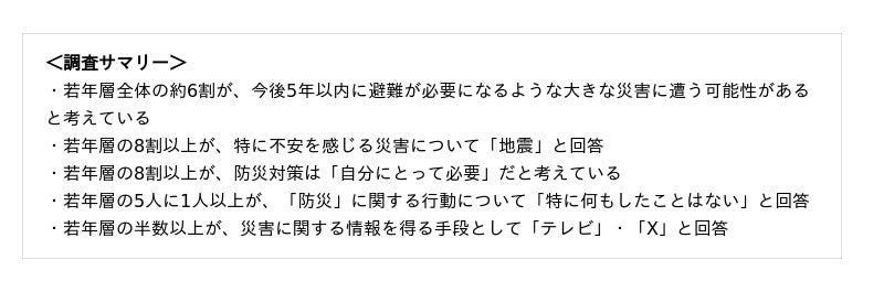 本調査から、若年層は災害への不安や防災の重要性を認識しているものの、防災行動の実践には十分に反映されていない状況が浮き彫りになりました。進学や就職、一人暮らしの開始など、新生活期は、自分の生活が一変する時期でもあるため、防災を見直す重要なタイミングです。若年層が日常生活の中で無理なく防災に取り組めるよう、分かりやすく身近な情報提供や、行動のきっかけづくりが今後ますます求められます。