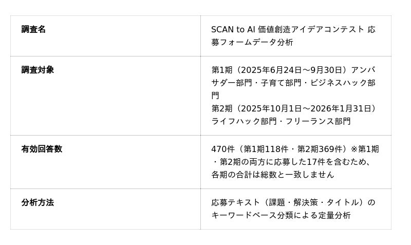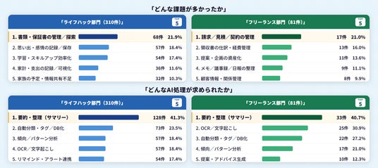 第2期(2025年10月~2026年1月)では、ライフハック部門とフリーランス部門を通じて、応募アイデアを「どんな課題が多かったか」、「どんなAI処理が求められたか」の2つの観点で分類・集計したところ、ライフハック部門では、「期限が記載された紙の情報を見落とさず管理したい」、フリーランス部門では、「業務書類の正確な読み取りが実務上の優先事項になっている」ことが分かりました。